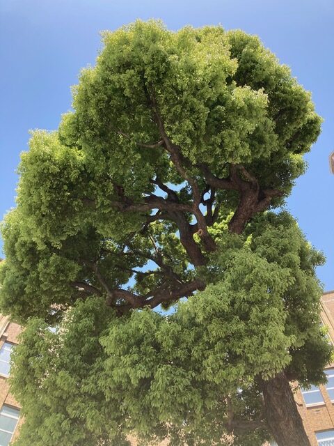 モクモクとと沸き立つ入道雲のようなクスノキの大木の若葉は、