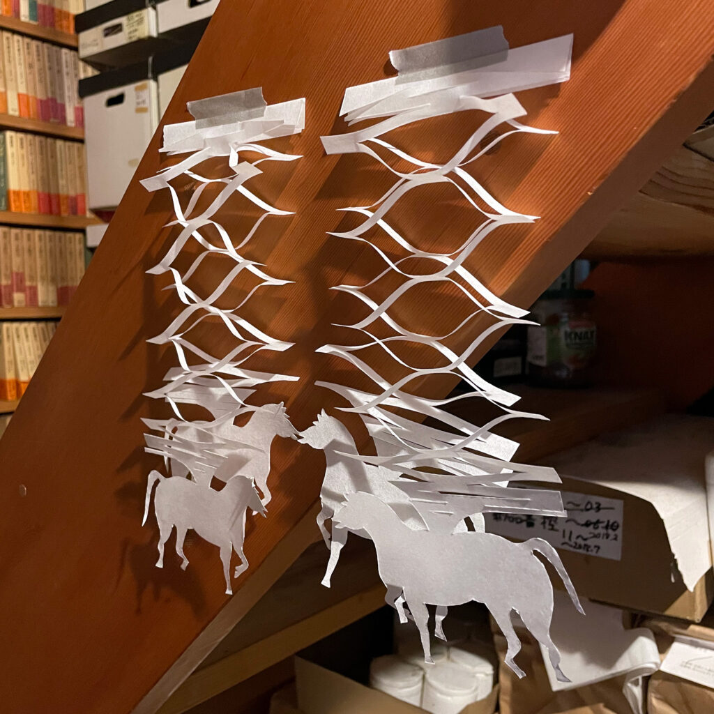 半紙を切ってつくる紙しめ縄です。一枚で馬が四頭切れて、風に揺れる様子が群れで遊ぶよう。