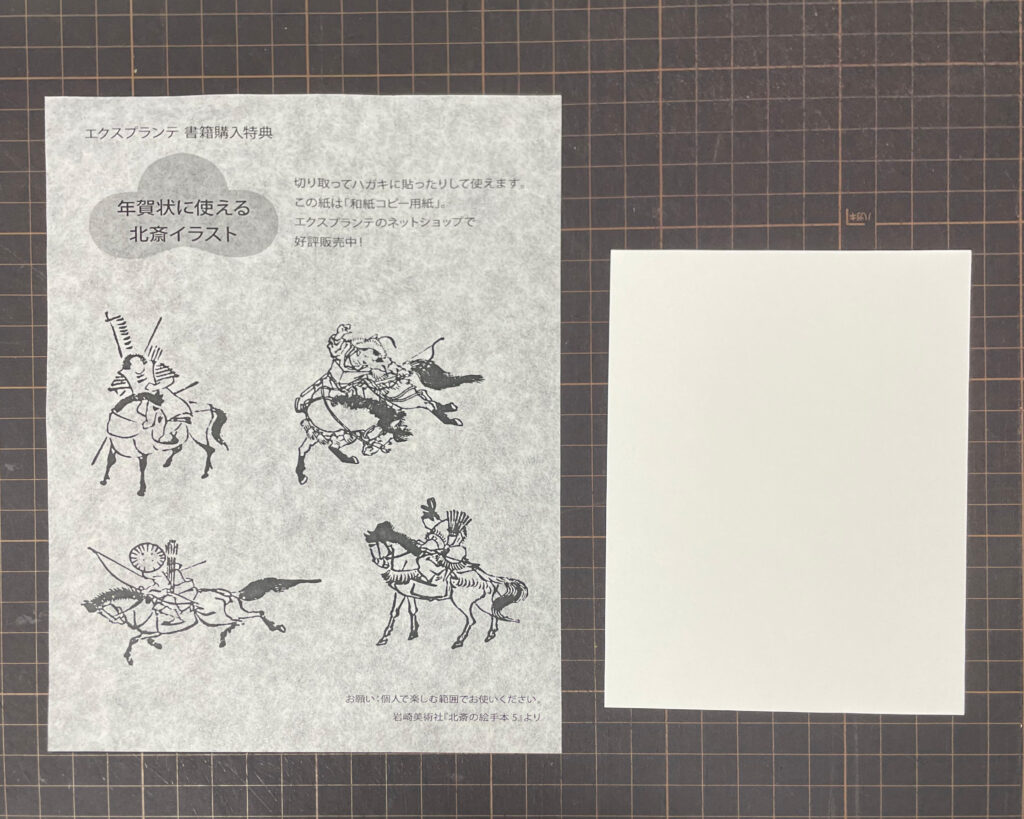 エクスプランテのネットショップから書籍をご購入いただくと、年賀状やグリーティングカードに使える、北斎イラストのカットを和紙コピー用紙に印刷してプレゼントします。