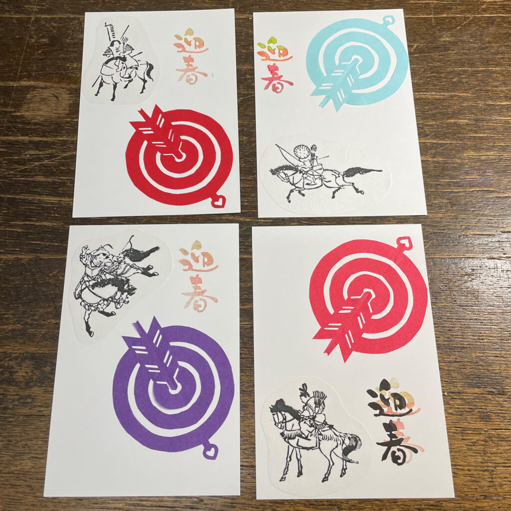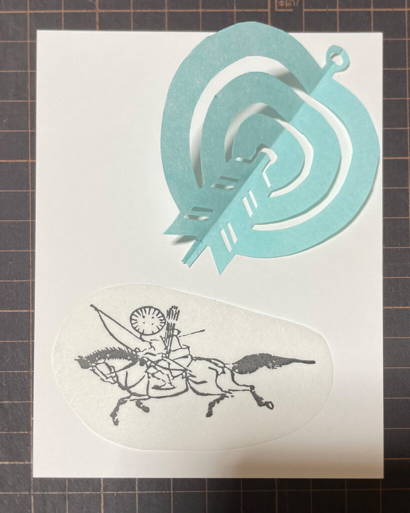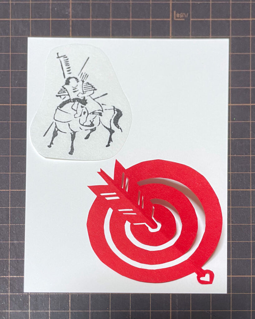 「丸的に当り矢」は『紋切り型 めでたづくし』『紋切り型mini 紙あそび歳時記 お守りもんきり』に収録しています。