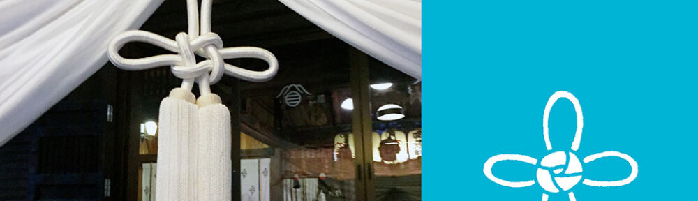 鳥居をくぐり、小砂利を踏み、掃き清められた境内を進む。拝殿でかしわ手を打った後、ふと見上げれば、すっかり正月支度で、白い幔幕に美しい総角結び。髪を結い上げ角のようなかたちにしたものを総角といい、これに似た結び目も同じ呼び名。結び目の重なり方が「入」の字のものは調度品用、「人」の字のものは武具用の結び方だという。この紋は「総角」。
