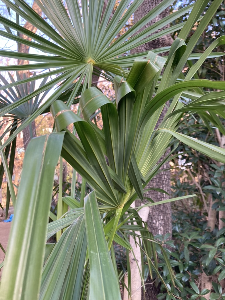 あれ?シュロの葉っぱがなんだか不自然にクルクルしてる。