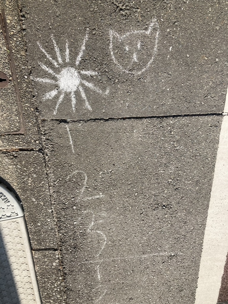 お!久々に見つけた道路の上のチョークの跡。