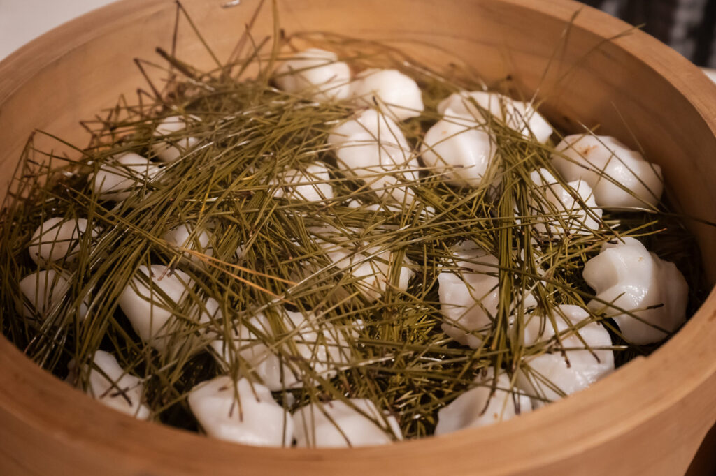食べるのは、アカマツの葉で蒸すソンピヨン。