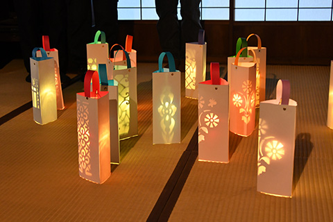 園内のたてものに施された文様の切り紙を作り、それを使って行灯にします。