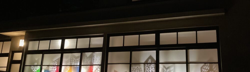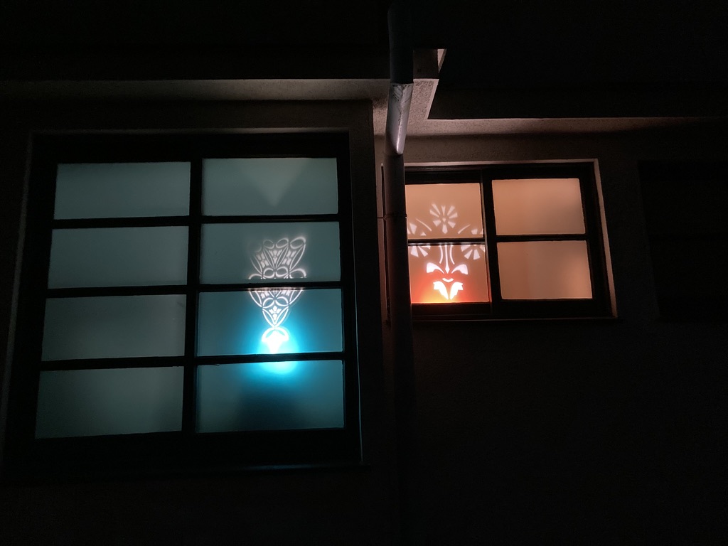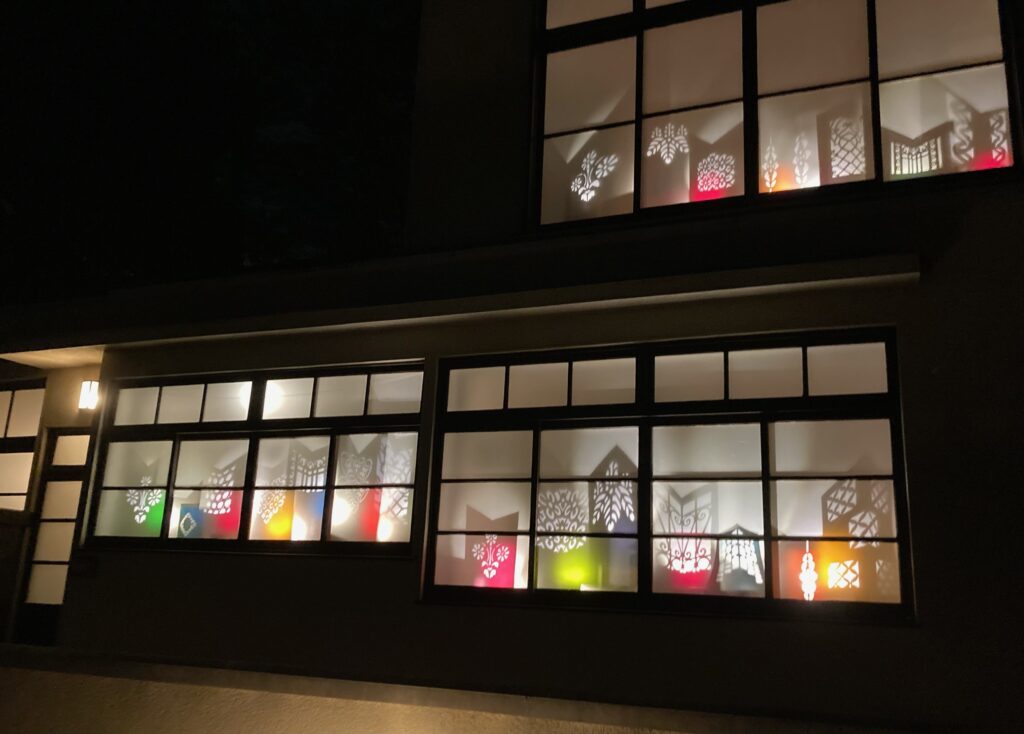 古い写真館のすりガラスに「たてもの文様」切り紙を配置。