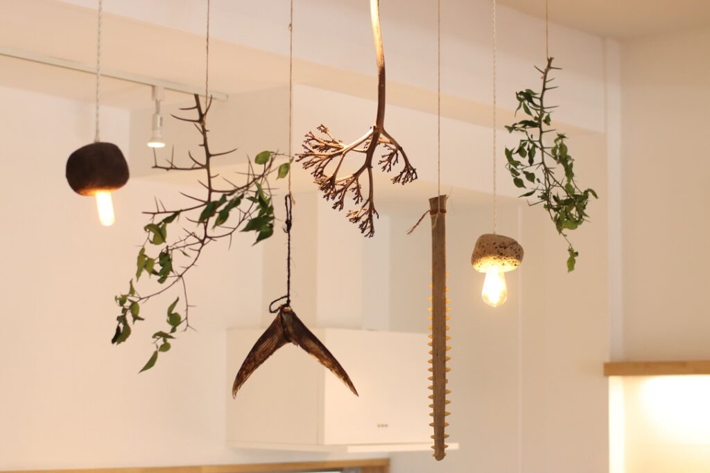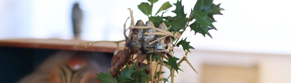 鋭い棘の柚子の枝、ノコギリザメの口吻。(これは魔除けとされているもの)