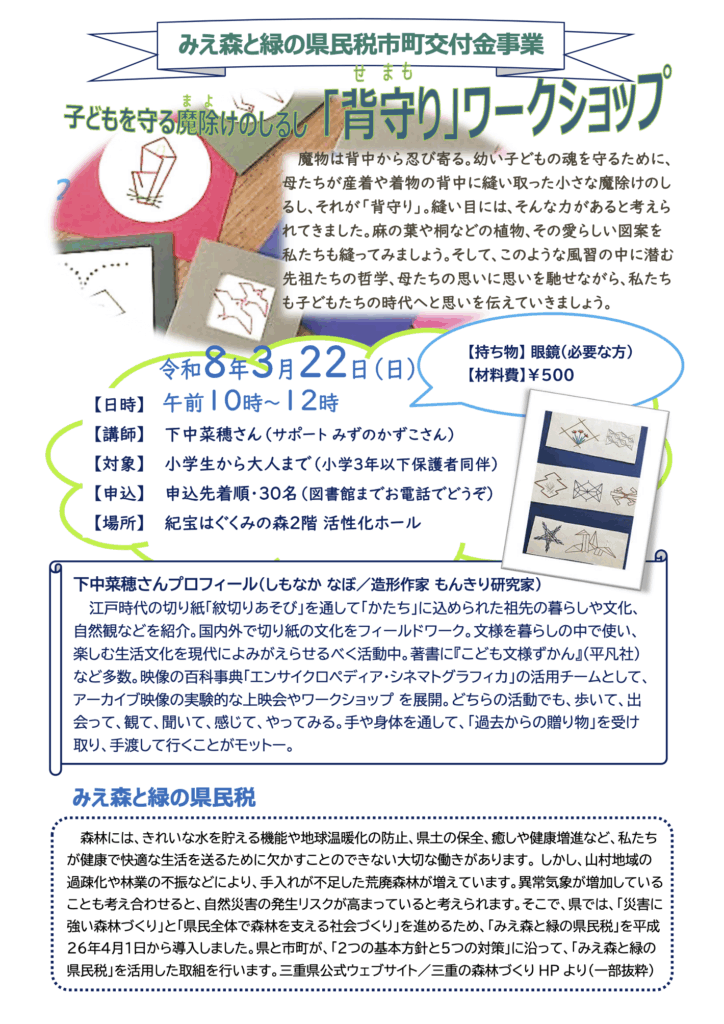 背守りワークショップ、EC上映会 三重・紀宝はぐくみの森 2026年3月22日
